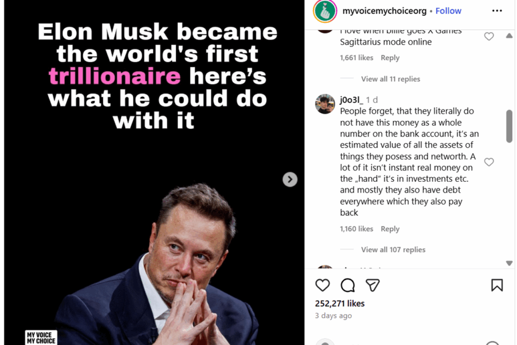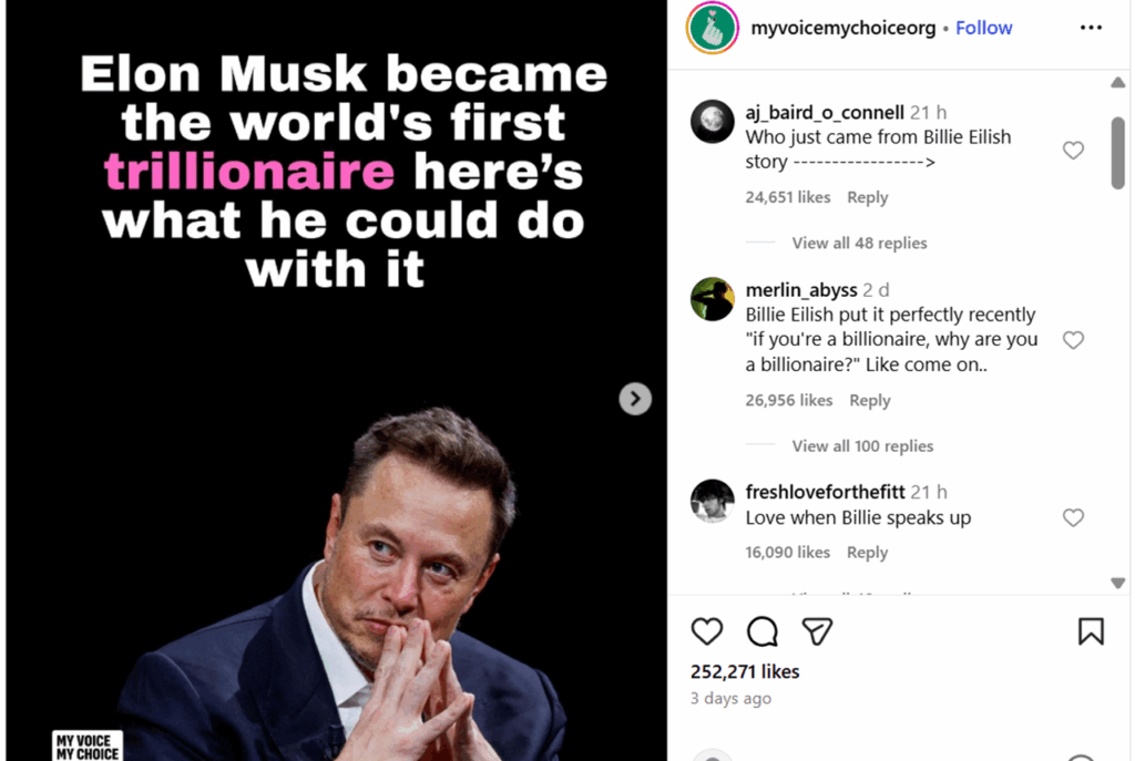 In the November 11 post by @myvoicemychoiceorg on Elon Musk’s trillionaire status, many users wrote in the comments that they were directed to the carousel after they saw Billie Eilish’s Instagram Story. Several users appreciated the singer’s straightforward nature, while others were keeping count of users who came to know of that post from Eilish’s story.